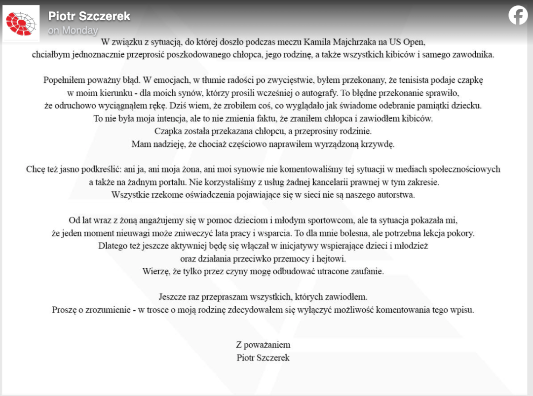 就在舆论汹涌到顶点后,Piotr Szczerek终于在9月1日通过官方账号发表了道歉声明。他强调,这是自己第一次也是唯一一次公开发声,之前那个“先到先得”的发言并不是他写的。